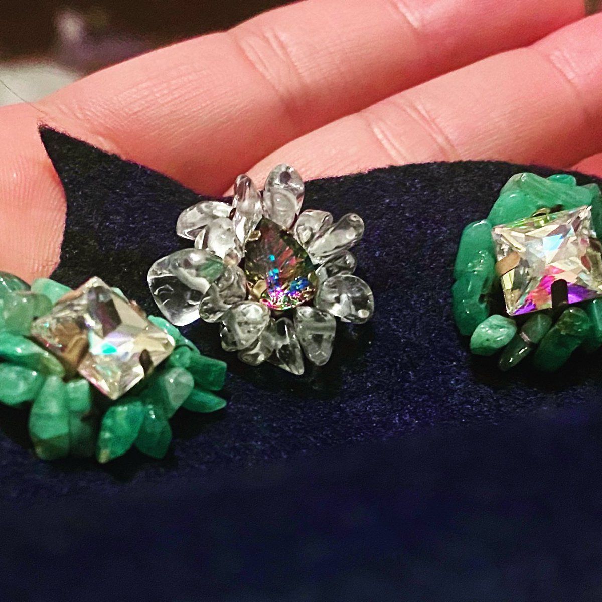 ちなみに7月誕生石はルビーなんだけど、なんと針が石を通らない😇ので、ルビーインゾイサイトでちょっと民族アクセサリーぽくなったぞ!(またフェルト見えてる笑) https://t.co/PUhVGfk0Jg